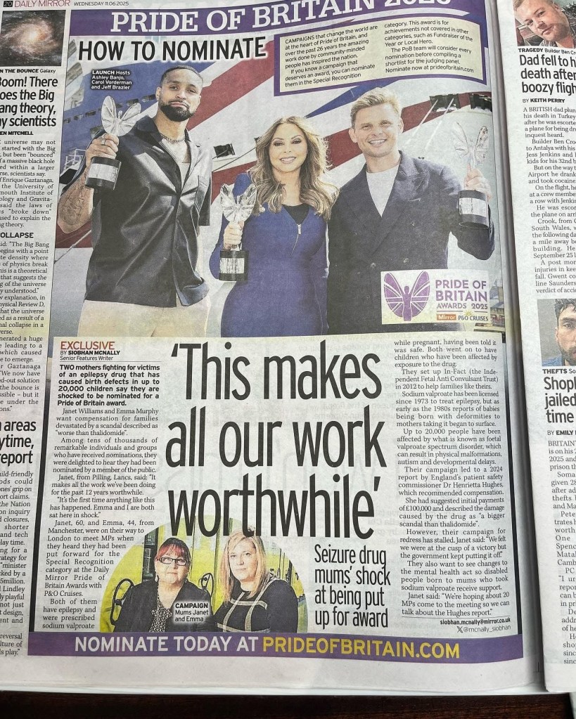 All the above nominations and awards were accepted proudly on behalf of each and every child / adult and their families that have been harmed by Sodium Valproate and other Epilepsy Medications in Pregnancy.
